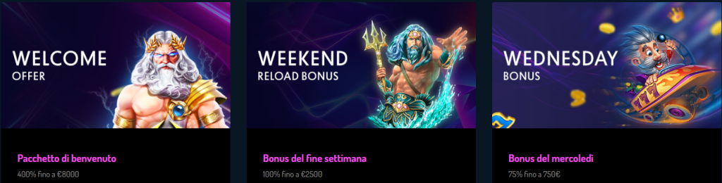 Il pacchetto di benvenuto arriva fino a 5 000 € complessivi, con ulteriori promozioni settimanali come il Bonus Weekend (100% fino a 2 500 €) e il Bonus del Mercoledì (75% fino a 750 €).