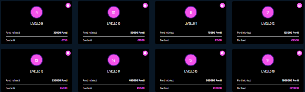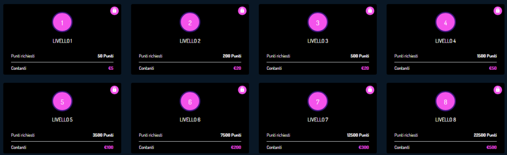 - Una volta raggiunta la soglia, il livello viene sbloccato e il giocatore riceve una ricompensa in denaro reale (cash, non bonus).