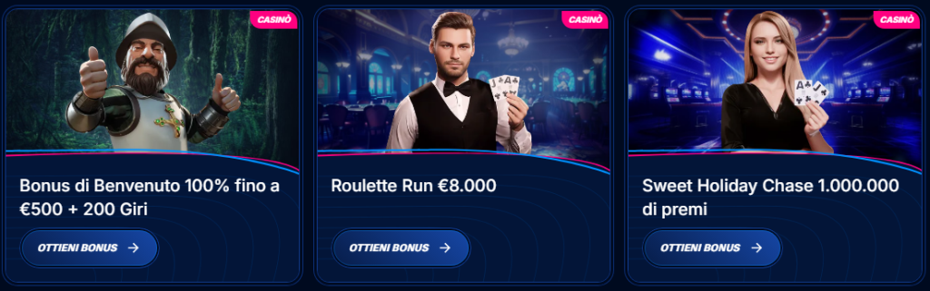 Boomerang è un casinò online attivo dal 2020, noto per un’interfaccia moderna, ampia scelta di giochi e bonus competitivi. L’offerta di benvenuto include un 100% fino a 150€ accompagnato da 200 giri gratuiti, attivabili con un deposito minimo di 20€ e condizioni di puntata 3x. Il sito opera con licenza Curaçao ed è disponibile in diverse lingue, tra cui italiano, inglese, polacco, tedesco, russo, finlandese, ungherese e norvegese. Supporta molte valute come EUR, USD, CAD, NOK, PLN, INR e altre, offrendo così accesso facile ai giocatori internazionali.
