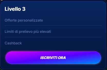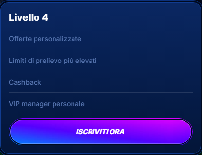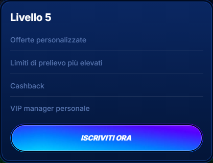 | Livello VIP | Promozioni sul sito | Live Chat 24/7 | Offerte personalizzate | Limiti di prelievo più elevati | Cashback | VIP Manager personale |