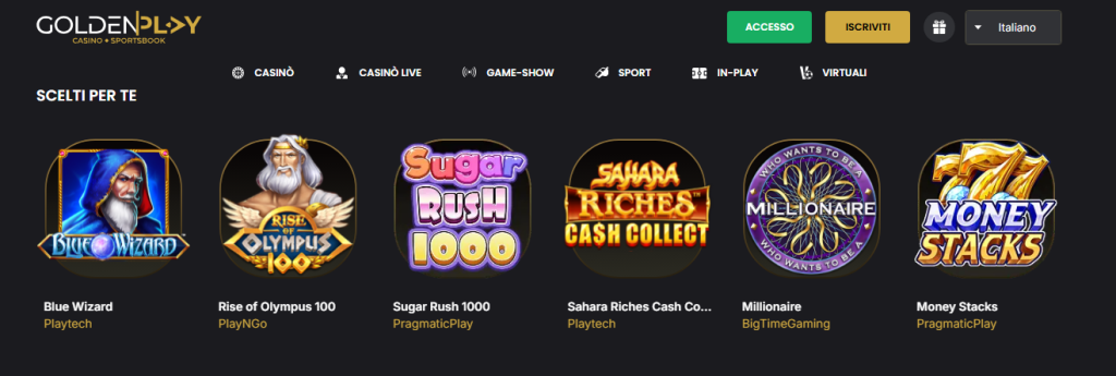 Il palinsesto di GoldenPlay Casino è ampio e adatto a tutti i tipi di giocatori, dai fan delle slot agli appassionati di giochi da tavolo e live. La piattaforma collabora con provider di primo livello (come NetEnt, Pragmatic Play, Evolution Gaming e Play’n GO), garantendo una scelta ricca e sempre aggiornata.
