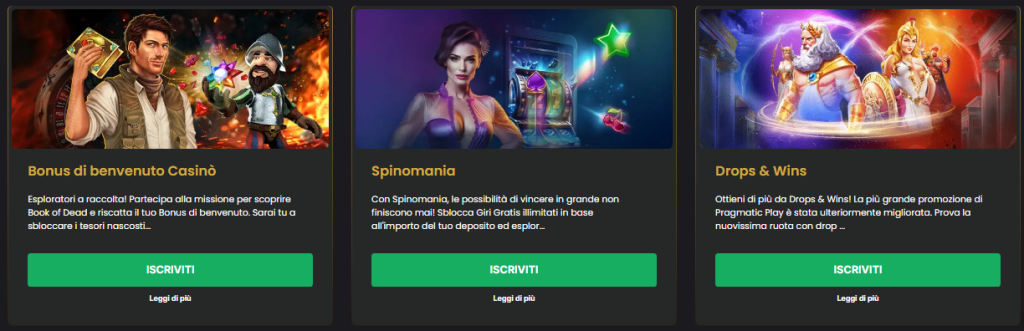 Attiva l’account tramite email di conferma, effettua il primo deposito (minimo 10 €) e sblocca il bonus di benvenuto fino a 555 € + 100 giri gratis.