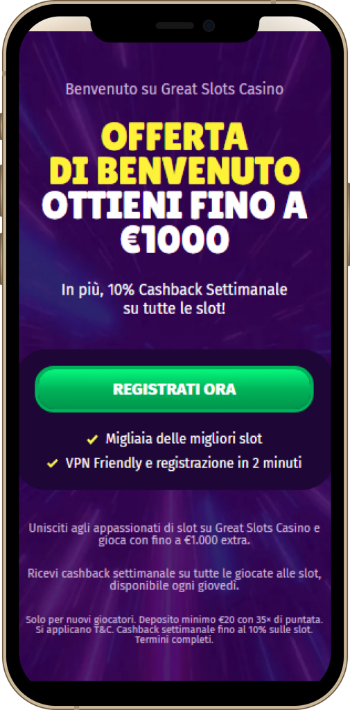 GreatSlots Casino è un operatore online lanciato nel 2024 e gestito da Fortune Forge Limited, società registrata in Costa Rica. Il sito dispone di un ambiente moderno e offre un pacchetto di benvenuto fino a 1000 € più 10 % di cashback settimanale sulle perdite. Il deposito minimo richiesto è di 20 €, mentre anche il prelievo minimo parte da 20 €, con tempi di elaborazione rapidi (entro 24 ore per i portafogli elettronici). Le transazioni sono possibili tramite Visa, MasterCard, Skrill, Neteller, MiFinity, Jeton, bonifico bancario e diverse criptovalute come Bitcoin, Ethereum, Tether e Litecoin. La piattaforma è disponibile in inglese e spagnolo, supporta la valuta euro (EUR) e propone un’assistenza clienti 24/7 via chat o email. GreatSlots punta su bonus ricorrenti, cashback e un’ampia selezione di slot e giochi live, mantenendo un’interfaccia semplice e accessibile.