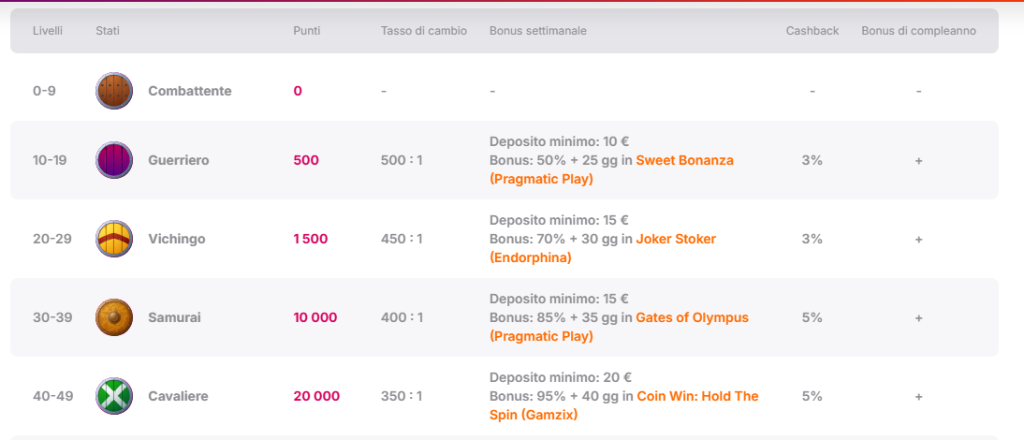 | Livelli | Punti | Tasso di cambio | Bonus settimanale | Cashback | Bonus di compleanno |
