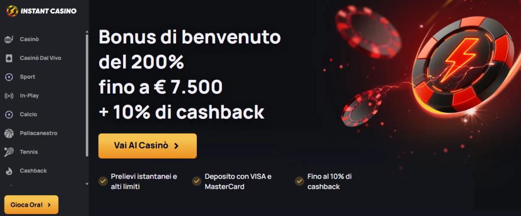 Instant Casino è un portale nato nel 2024 e gestito da Simba N.V.; opera con licenze di gioco emesse dal Curaçao Gaming Control Board (licenza OGL/2024/1788/1030). Il sito propone un bonus di benvenuto del 200 % fino a 7 500 € con requisiti di puntata sull’importo depositato intorno a 15 volte e scadenza di sette giorni, inoltre, ogni settimana accredita un cashback del 10 % senza alcun requisito di scommessa. Per cominciare basta un deposito minimo di 20 €, mentre l’importo minimo per il prelievo è di 25 €, la piattaforma tratta le richieste di prelievo in modo istantaneo e fissa limiti di 4 000 € al giorno, 10 000 € a settimana e 20 000 € al mese. La cassa di Instant Casino accetta numerosi metodi di pagamento, tra cui carte di credito/debito (Visa e Mastercard), sistemi bancari come Giropay e SOFORT, portafogli digitali quali Apple Pay, Google Pay e MiFinity, oltre a un’ampia gamma di criptovalute come Bitcoin, Ethereum, Cardano, Litecoin e Tether, caratteristiche che lo rendono uno dei più moderni casinò non AAMS con prelievo immediato disponibili sul mercato europeo.
