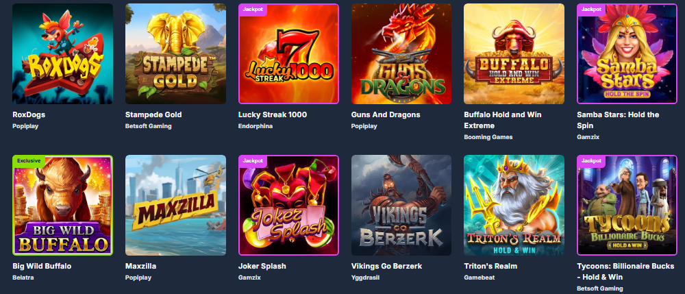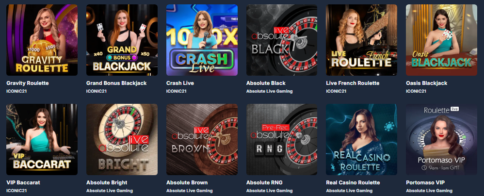 Slot, roulette, blackjack, baccarat, poker, giochi dal vivo, giochi crash, giochi da tavolo e titoli con jackpot.