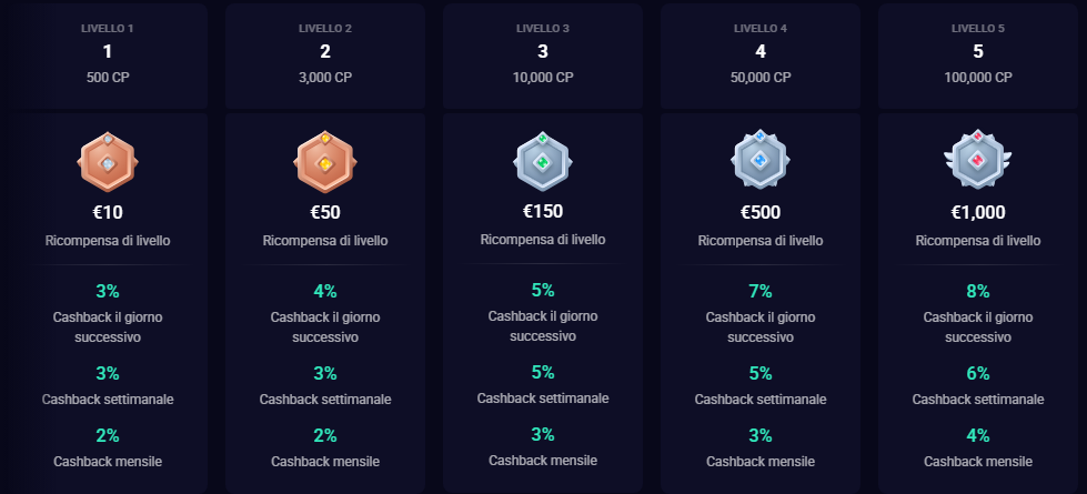 | Livello | CP Richiesti | Ricompensa di Livello | Cashback Giornaliero | Cashback Settimanale | Cashback Mensile |