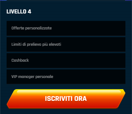 | Livello 4 | Offerte personalizzate, Limiti di prelievo più elevati, Cashback, VIP manager personale |