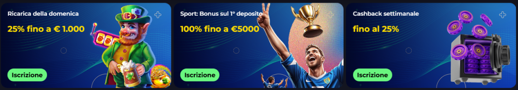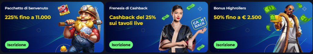 Il deposito minimo varia a seconda del metodo di pagamento: generalmente parte da 20–25 €, mentre con alcune criptovalute può essere più basso.
