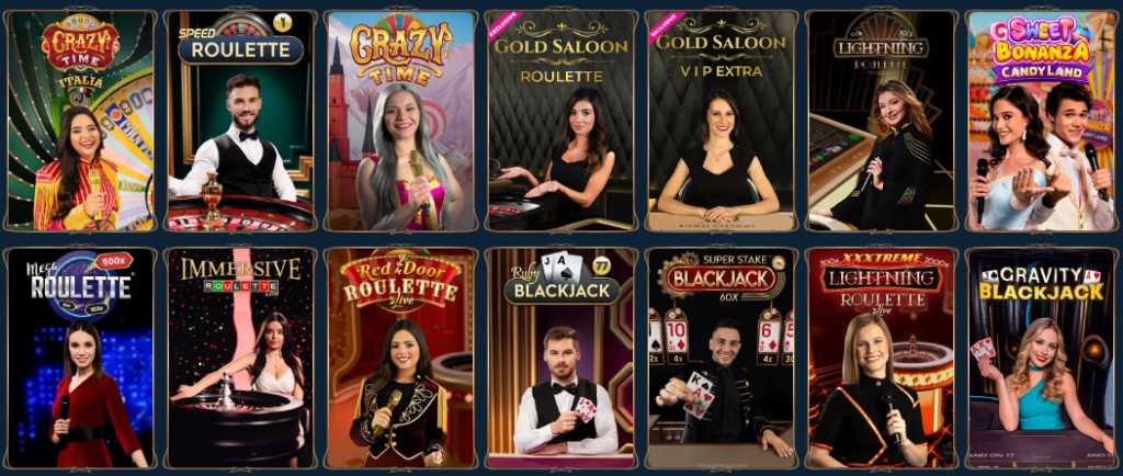 - Live Casino – roulette live, blackjack live, baccarat live, game show interattivi