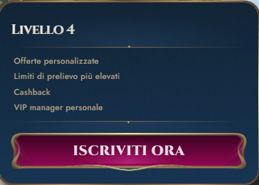 | Livello 4 | Offerte personalizzate, Limiti di prelievo più elevati, Cashback, VIP manager personale |