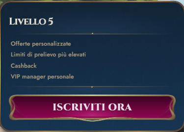 | Livello 5 | Offerte personalizzate, Limiti di prelievo più elevati, Cashback, VIP manager personale |