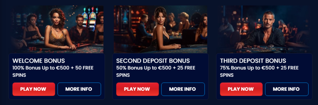 I nuovi giocatori ricevono un bonus del 100% fino a 500 € + 50 giri gratuiti sul primo deposito. Il requisito di scommessa è x35 sull’importo del bonus e del deposito.