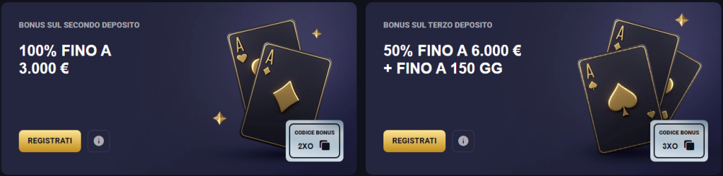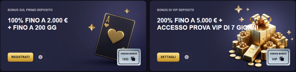 | Boost d’ingresso (promo) | 200% fino a 5.000 € + prova VIP 7 giorni (codice VIP) |