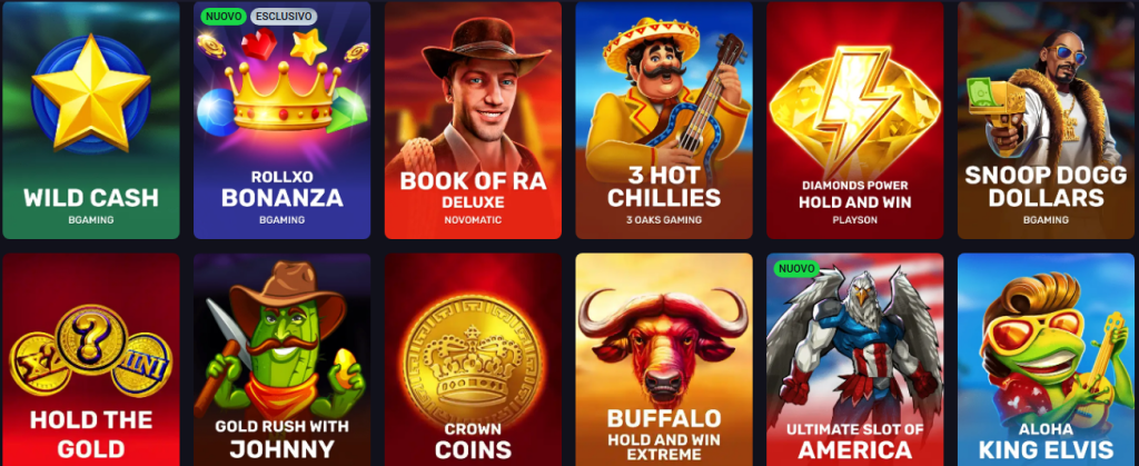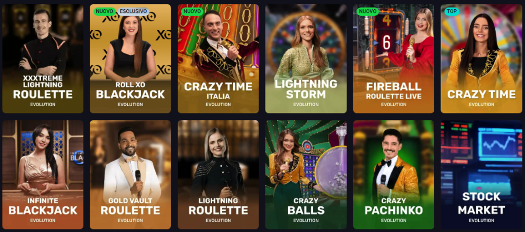 Il catalogo supera i 12.000 titoli tra slot, roulette, blackjack, baccarat, poker, giochi con jackpot, bingo, crash game come Aviator e un’ampia sezione di live casino.