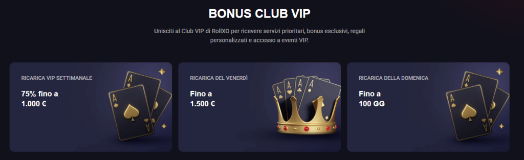 Il Club VIP di RollXO premia i giocatori abituali con vantaggi crescenti: cashback settimanale, bonus esclusivi, inviti a eventi e manager personale ai livelli avanzati. Per entrare nel club è necessario raggiungere 2.500 € di depositi cumulati sul conto di gioco. Inoltre è disponibile un Deposito VIP dedicato che accelera l’accesso ai benefici. I limiti di prelievo aumentano per i membri VIP rispetto a quelli standard. Verifica sempre la pagina ufficiale per eventuali aggiornamenti.