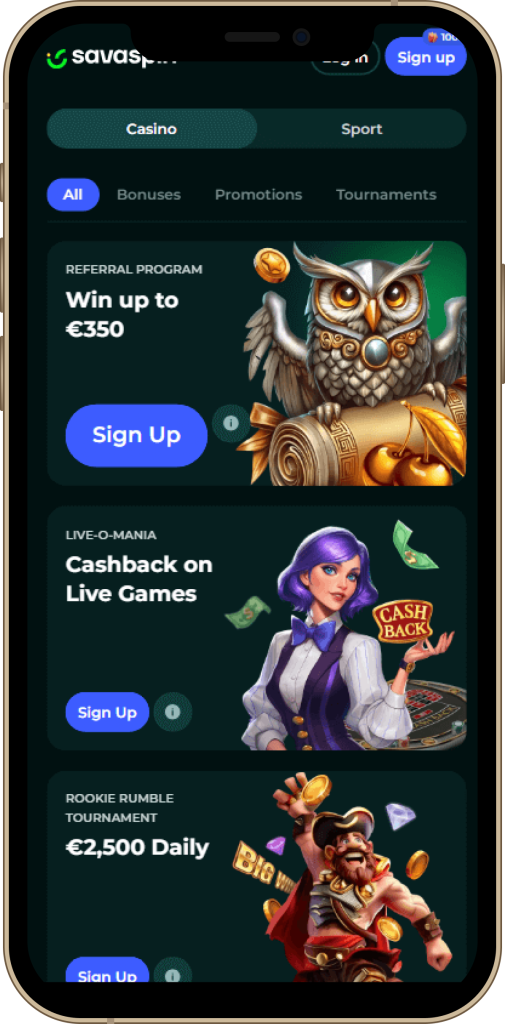 SavaSpin è progettato per offrire un’esperienza di gioco fluida anche su smartphone e tablet, senza la necessità di scaricare un’app dedicata. L’interfaccia si adatta automaticamente a qualsiasi dimensione dello schermo, garantendo accesso rapido ai giochi, alle promozioni e alle funzioni di cassa. Che tu sia a casa o in movimento, puoi goderti la stessa qualità e sicurezza della versione desktop.