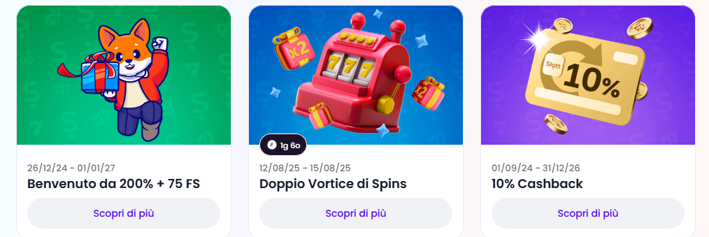 Slott Casino, operativo dal 2024 con licenza del Curacao Gaming Control Board, propone un’ampia selezione di slot, giochi da tavolo e casinò live. Il pacchetto di benvenuto prevede un bonus del 200 % fino a 20 000 € e 75 giri gratuiti, oltre a cashback giornaliero del 10 % e promozioni periodiche come il “Refer & Rule” con free spin aggiuntivi. Il deposito minimo accettato è di 1 €, mentre per attivare il bonus iniziale servono almeno 10 €. Il prelievo minimo è di 10 € e le transazioni non prevedono commissioni da parte del casinò, salvo eventuali costi del provider di pagamento. Tra i metodi supportati figurano Visa, MasterCard, bonifico bancario, Skrill, Neteller e varie criptovalute (Bitcoin, Ethereum, Litecoin, Tether, BNB), un riferimento utile per chi confronta siti scommesse senza limiti. I prelievi in crypto sono quasi istantanei, mentre quelli su carte o bonifici possono richiedere fino a tre giorni lavorativi.