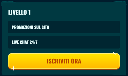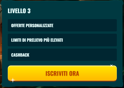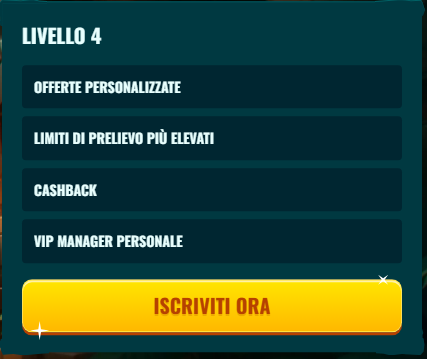 | Livello VIP | Promozioni sul sito | Live Chat 24/7 | Offerte personalizzate | Limiti di prelievo più elevati | Cashback | VIP Manager personale |