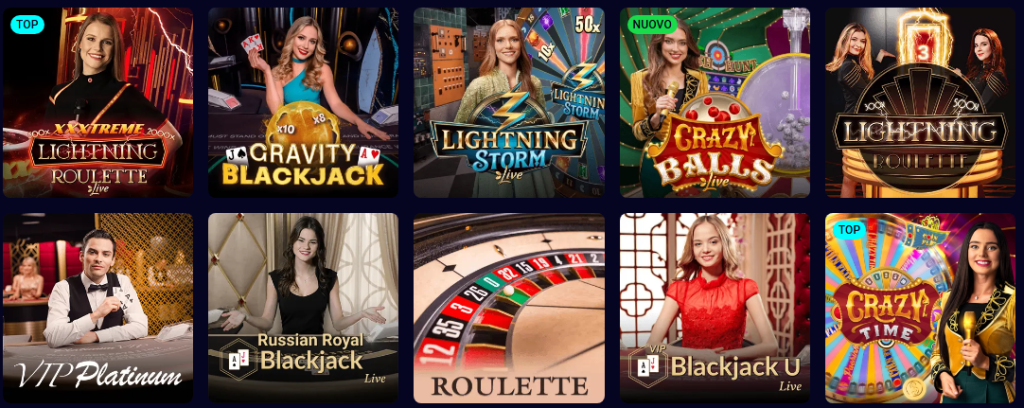 - Live Casino con croupier dal vivo (roulette live, blackjack live, baccarat live, game show)